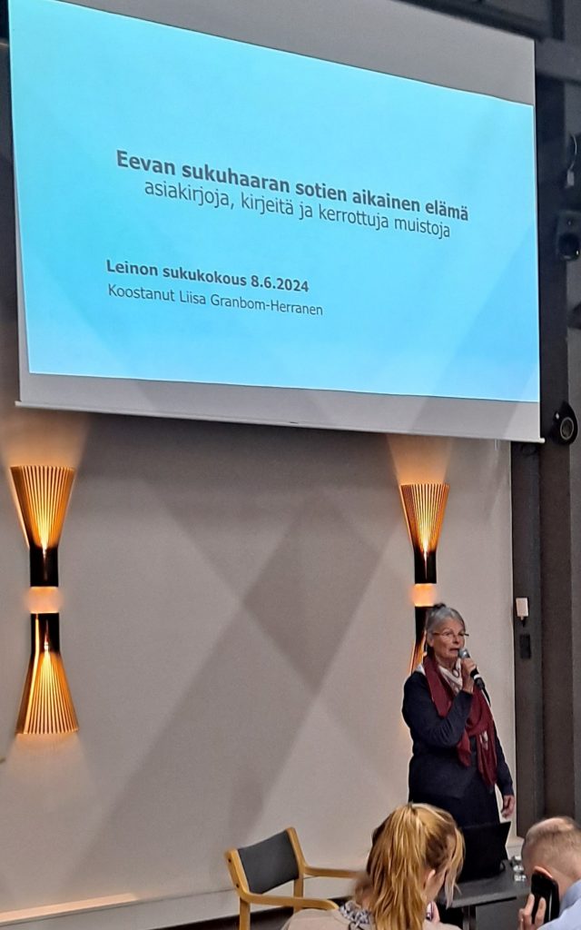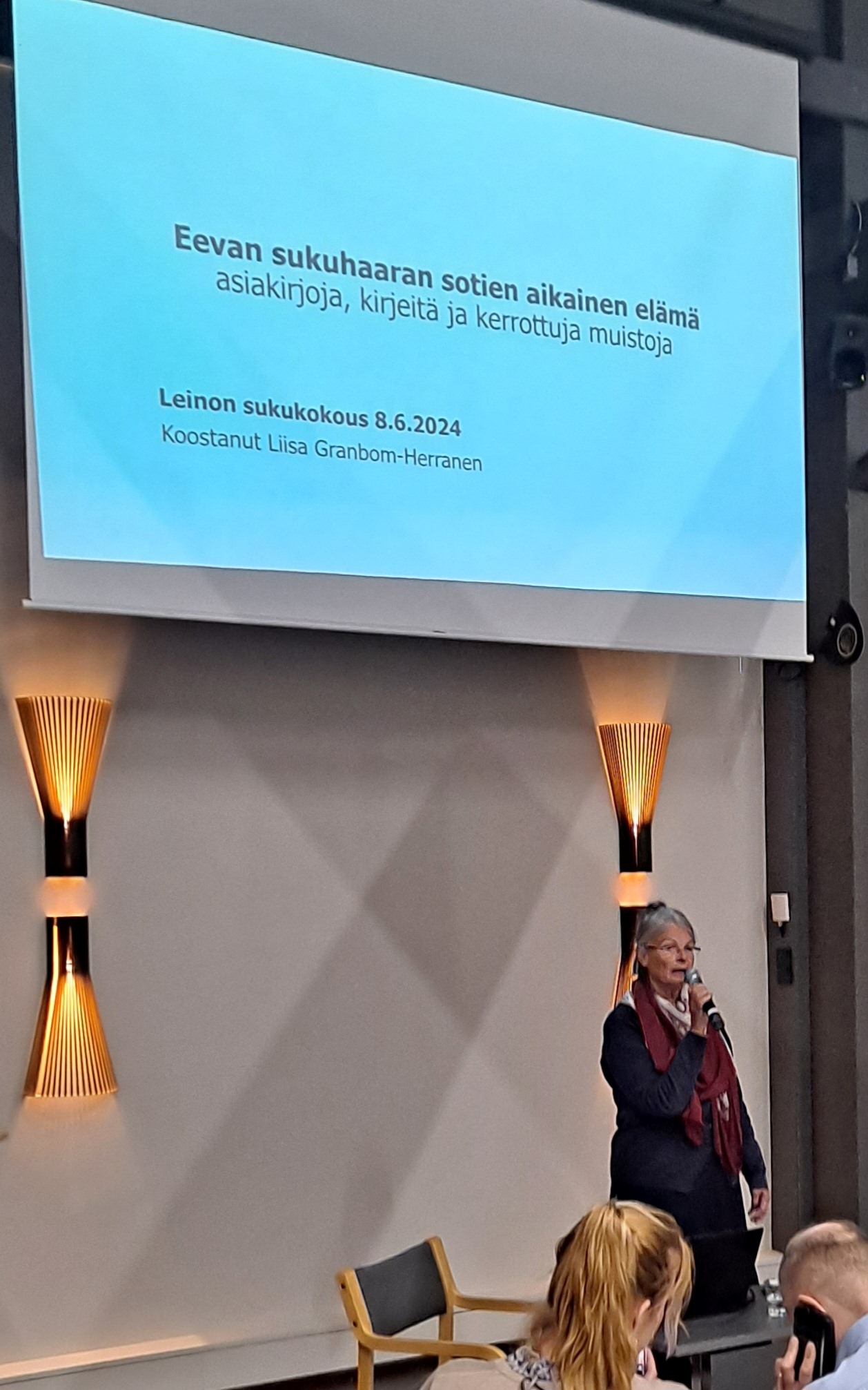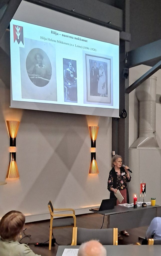 Pienen tauon jälkeen saimme kuulla mielenkiintoiset esitykset sukuhistoriasta. Paula Kokkonen kertoi tutkimuksistaan Hilja Mikkosen os. Leinon historiasta otsikolla ”Hilja nuorena nukkunut”. Liisa Granbom-Herranen kertoi Eevan sukuhaaran historiasta ja sukuhaaran sodan aikaisesta elämästä. Esitykset sisälsivät hienoja historiallisia kuvia ja artikkeleita.